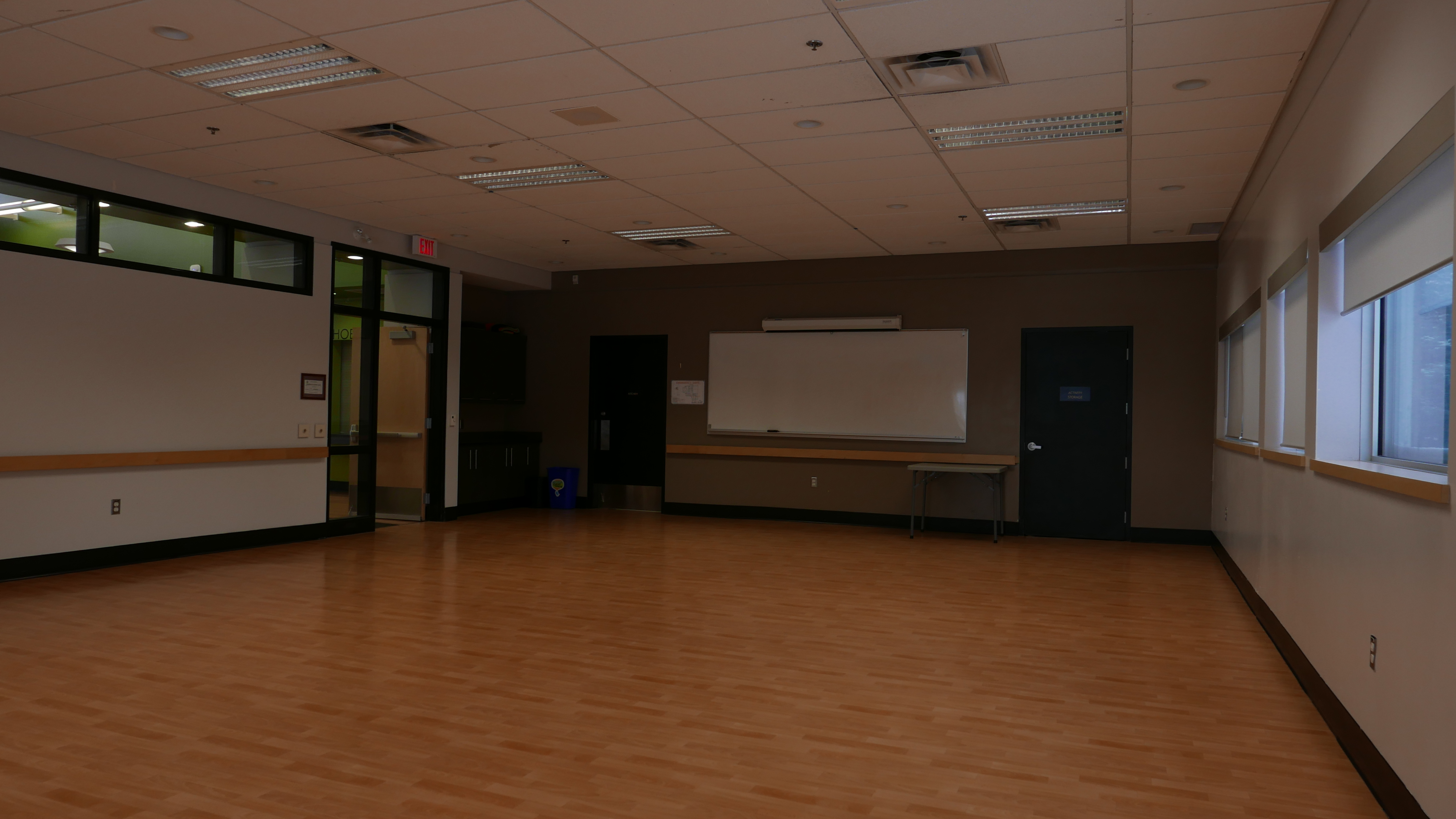 The multipurpose room seats up to 100 people. The room is surrounded by windows and has direct access to our commercial kitchen. An air-wall can be used to divide the MPR into two separate rooms. Two white boards, a screen and internet access makes it an ideal meeting space.